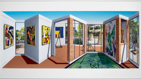 Patrick held his first solo show in 1961 at the Portal Gallery, London. It was the first one-man show by a Pop Artist, though they were not even called that then. Three and four years later, Hughes made two seminal reverse perspective works, Infinity and Sticking-out Room. But in the 1970s Hughes’ name became synonymous with rainbow paintings, which also became very popular as prints and as postcards; people enjoyed them as decoration, but for Hughes the rainbow represented a solidified experience.